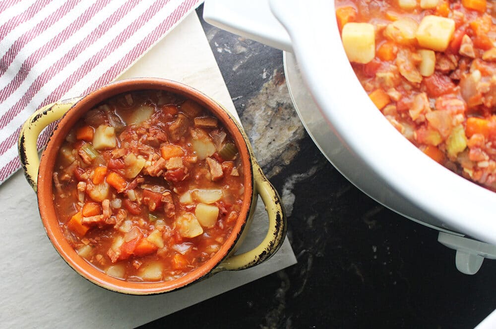 Potato soup made simple! Slow Cooker Ham and Potato Soup makes hearty and healthy possible. Adding Dei Fratelli Chopped Tomatoes with Onion & Garlic, potatoes, and carrots creates this healthy and hearty soup right in your slow cooker!